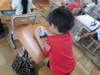 時計を使って「なんじ なんじはん」の学習をしました。時計には、長い針と短い針、1〜12の数字、目盛りがあることに気付き、針の指す数字を見ると、「何時」「何時半」が分かることを知りました。時計を読むだけでなく、自分たちで「〇時」の時計の針に合わすこともできました。