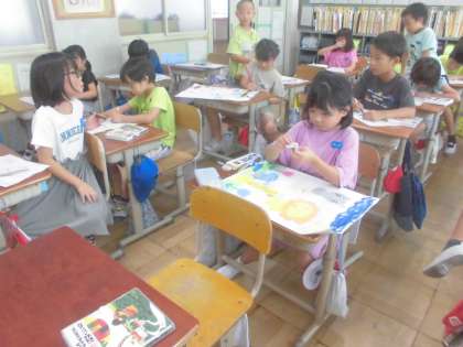 お話を聞いて絵に描き、今日は背景を仕上げました。