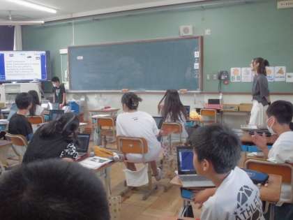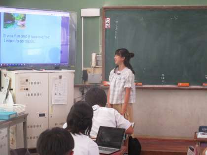 夏休みの思い出をパワーポイントで英語で発表しました。おいしいパスタを食べに行った話や川や海へ行ったことなど、それぞれの思い出を発表しました。今日は、ALTのエマ先生もいらっしゃったので、英単語など発音も教えてもらいながらの発表でした。