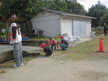 運動会に向けて、運動場の整備として全校で草引きをしました。一見、雑草がないように見えて探してみると、運動場の端の方やマットの間などに雑草がありました。30分間が終わるとたくさんの雑草が袋いっぱいになっているクラスもありました。