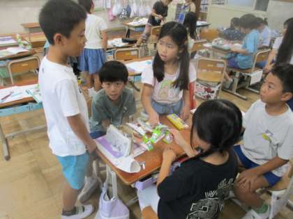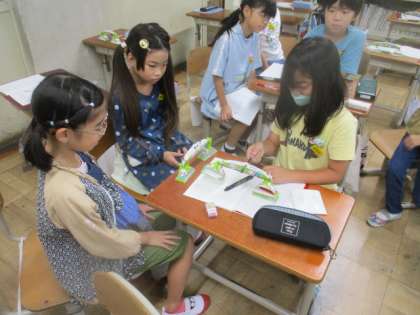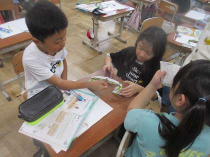 算数の「重さ」の学習で、教科書についていた自分で作るてこを使って、文房具が1円玉何枚と同じ重さかを調べました。みんな楽しそうに調べていました。