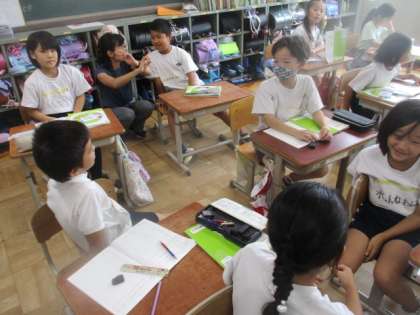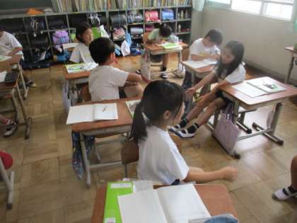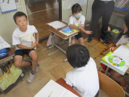 理科の「かげと太陽」の学習で、太陽の動きを調べています。調べる前にペアの人と相談をして、予想を立てました。太陽は、予想した通り動くのでしょうか。