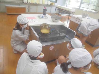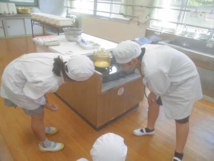 ご飯をたく調理実習をしました。最初に、米に水を吸水しました。その際、米の量や水の量を計量カップで調べていました。