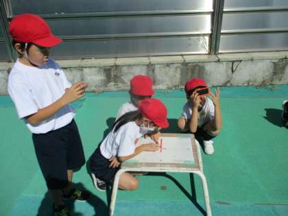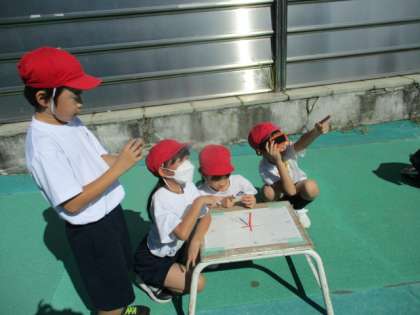 影と太陽の位置を午前9時から午後3時まで1時間ごとに調べました。1時間後でも大きく変化する影と太陽の位置に驚いていました。