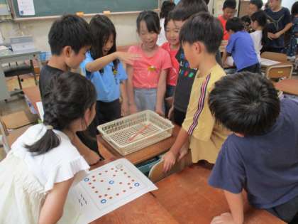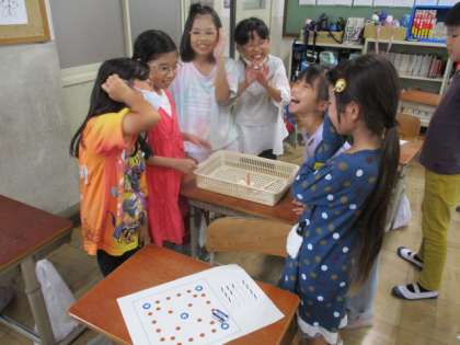 道徳の時間に、隣の国の韓国・朝鮮について学習しました。地図を見て,日本からとても近いことや、キムチを食べたことがあるなど、知っていることを話していました。その後、マダンの写真を見て、日本とは違う太鼓があることを知りました。最後に、すごろくに似た韓国・朝鮮の昔の遊び「ユンノリ」で楽しく遊びました。