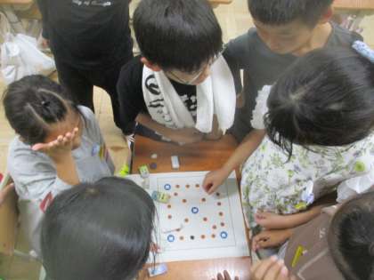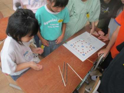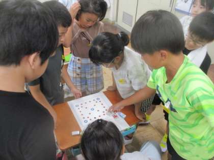 10月の「こころの日」の学習は、「となりの国(韓国・朝鮮)の文化に親しもう」というテーマで、「ユンノリ」をして遊びました。ユンノリは、日本のすごろくと似た遊びで、みんな楽しく遊んでいました。授業が終わってからも「またやりたい。」とか「休み時間もやってもいいですか。」とか聞きに来る人もありました。