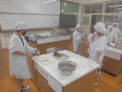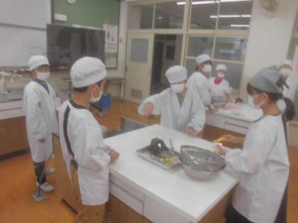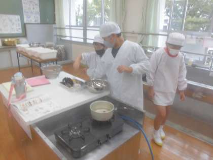 その後は、みそ汁の調理実習をしました。だしの取り方や野菜の切り方、実のいれる順番などを考えて調理をしていました。テキパキと班で声をかけあってやっていたので、とてもスムーズにできていました。お家でも作ってみたいと感想を述べていました。
