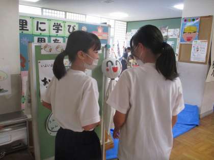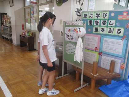 里のホールに飾られているてるてる坊主を見ている6年生がいました。