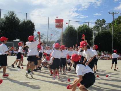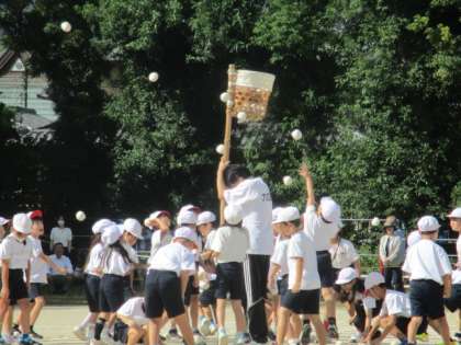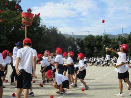 赤組と白組に分かれ、1〜3年生の玉入れに出る子ども達が、力を合わせて玉入れをしました。狙って投げた球がかごの中にどんどん入っていき、たくさん入りました。