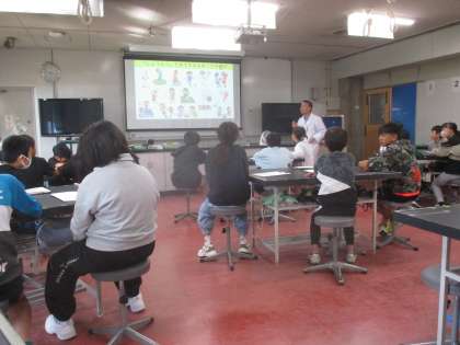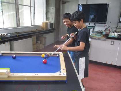 後半は、ビリアードをしました。ビリアードは、キューと球との衝突、球と球との衝突、球と壁との衝突などがあるので、壁からの撥ね返り方も考えて、ゲームをしていました。学校では、できない体験があり、子どもたちも熱心に学習することができました。
