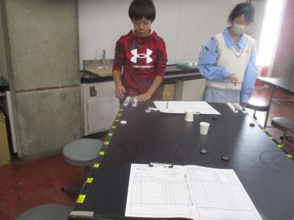 物と物が衝突するとどんなふうに反応するのかをおはじきを使って実験しました。重さや飛ばす力を変えて、何度も実験し、データをとっていました。最後には、データをもとにペアでおはじきゲームで対戦しました。