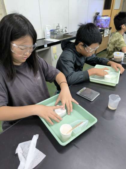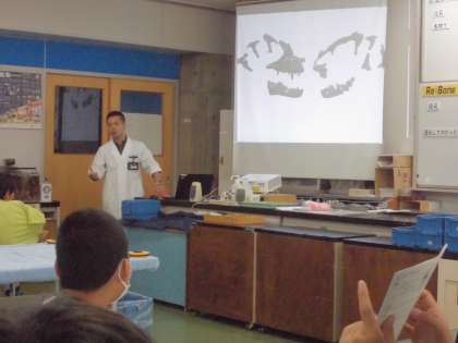 投稿が遅くなりましたが、先週の科学センター学習で地学「Re:BORN」の学習をしました。骨を蘇らせる学習ということで、まずは、みんなで何かわからない骨の正体を探るために、グループで組み合わせたり、話したりして考えました。その後、「メガロドン」の歯の化石のレプリカ作りをしました。お土産も上手にできてとても楽しい学習となりました。