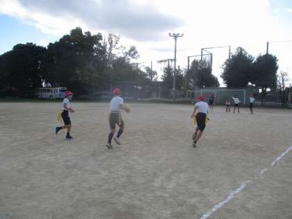 今日からタグラグビーの学習が始まりました。初めに、ルールや役割などを確認し、運動場へ。チームごとにボールをもって走り、「タグ!」の声が聞こえたら、パスする練習をしました。