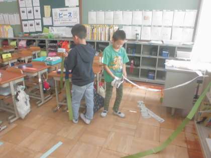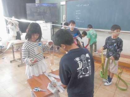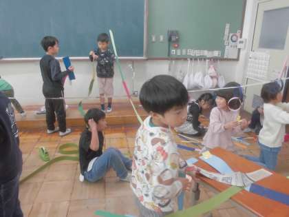 最後には教室いっぱいに紙をつないだり、つるしたりすることができました。