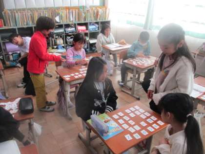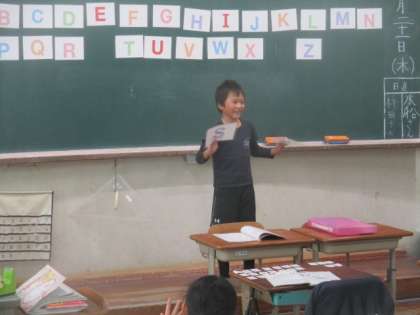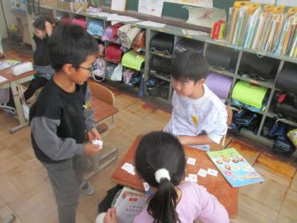 この日の外国語の学習もエマ先生が来てくれました。この日は、自分の頭文字のアルファベットのカードを友だちからもらうという学習をしました。みんな楽しそうに活動していました。