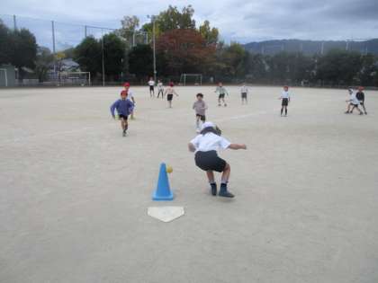 体育の学習で「ハンドベースボール」が始まりました。始めはルールがよくわからなかった人もやっているうちにわかってきたようで、みんな楽しそうに活動していました。