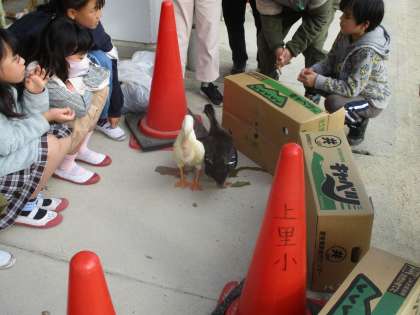 何かなと思って近寄ってみると、あいがもの触れ合いコーナー(?)が設置されていました。
