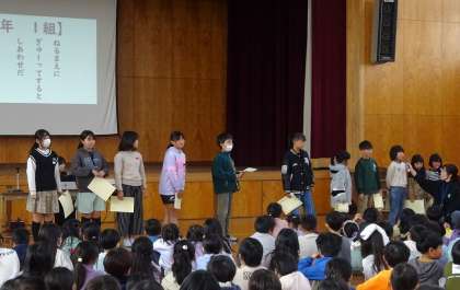 今日は、体育館で人権集会がありました。校長先生のお話の後、クラス代表の人権標語の紹介とその標語を作った思いを聞いていきました。