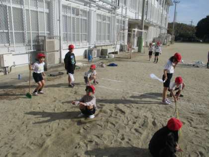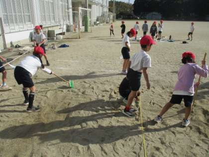 今、3年生は体育の学習で「走り幅跳び」をしています。砂場をならす係・とんだ距離を測る係・合図する係と分かれて、てきぱきと活動することができました。次は、より遠くに跳ぶにはどうすればいいか考えながら跳びます。