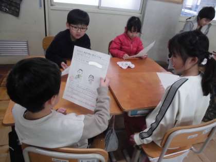 冬休みに、それぞれの家で行った「にこにこ大さくせん」の報告会をしました。