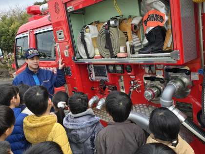 その後、3年生は社会の学習のため、消防車の見学をしました。消防車についているものや積んでいるものを見ながら、説明を聞きました。