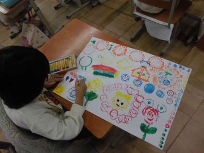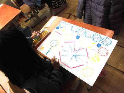 と、スタンプでできた形から想像を膨らませて絵を描いていました。