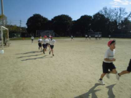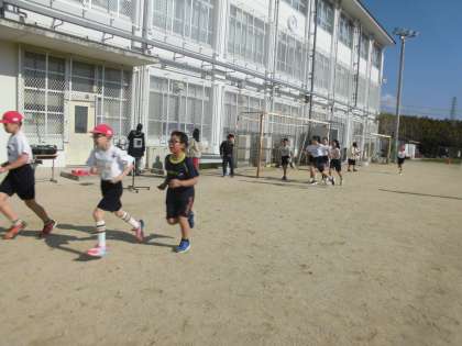 同じ速さで5分間を走り切ることができるように、互いに励まし合いながら練習しています。