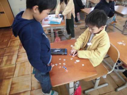 お店屋さんとお客さんに分かれて、色のシールをお買い物。