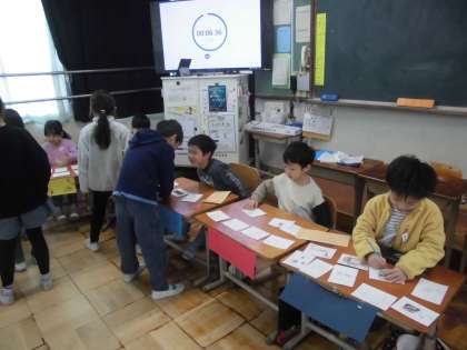 「くだもの」のような『まとめてつけた名前』を看板にして、お店屋さんごっこをしました。