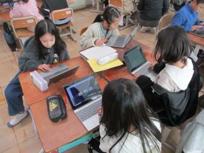 総合「地域のよさについて知ろう」の学習で、自分で調べた場所を紹介するプレゼンをロイロノートでつくっています。みんなで楽しそうに活動しています。