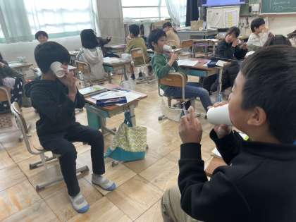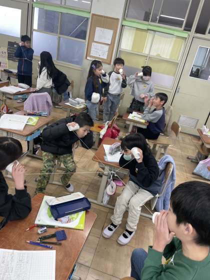 糸電話を使って,音が伝わっているときの様子を調べました。