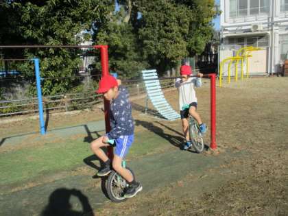 体育の学習で、一輪車と竹馬をしています。ふだんどちらも使って遊ぶことがないようで、乗れる人は少ないです。でも、友だちに補助してもらったり、何度も練習することで、「前より乗れるようになった。」というような声が何人かありました。休み時間も練習する姿が見られました。