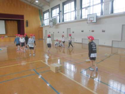 ゴムを2本重ねて跳んだり、箱を置いて箱跳びあそびをしたりしました。