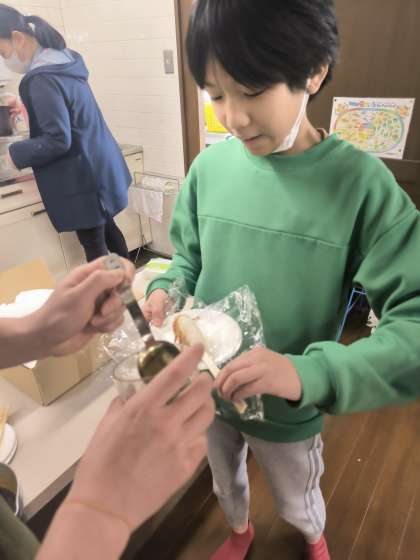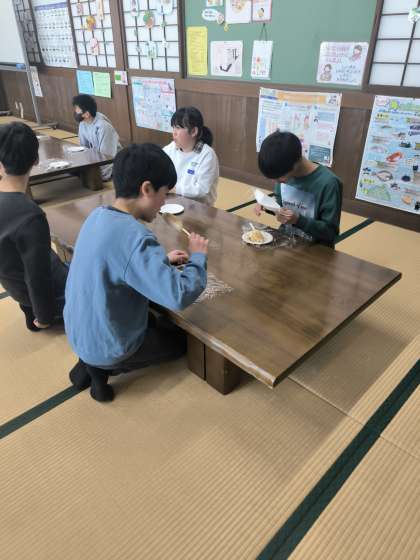 いろりの間で五平餅を食べました。自分たちで箸にもち米をつけて、形を整えて焼きました。おいしいタレをつけて食べました。おいしかったです。
