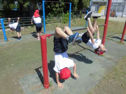 てつぼうあそび3時間目。少しがんばればできそうな技にも挑戦しました。「地球まわり」「こうもりおり」などに挑戦してできるようになると、飛び上がって喜んでいました。最後に友だちの地球まわりを見て、「次は私もやってみたい。」と次の学習への意欲も見られました。