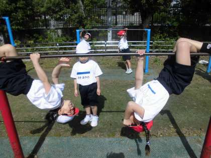 鉄棒で2人技にチャレンジ!ぶたのまるやきじゃんけんで楽しんでいました。
