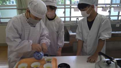 お茶を入れる実習ですが、コンロの使い方はじめ、準備や後片付け、協力しながら見通しをもちながら取り組まないといけないのが、難しかったようです。お茶も分量はおなじはずなのに、グループによって色の濃さや味にも違いがあり、「濃かったのでもう少しお湯を足すべきだった。」「全体的に量が少なかった。」などの反省点も出ていました。初めてなのに上手においしく入れられたグループもありました。お茶入れは奥が深い!と感じたようです。