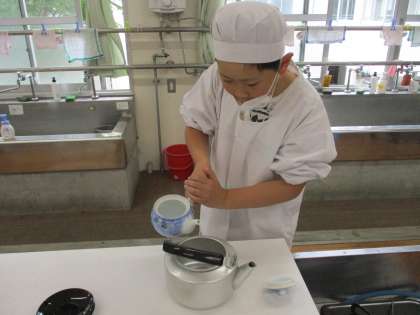 今日は、初めての調理実習でせん茶を入れました。班で協力してお茶っぱをはかり、お湯を沸かせました。