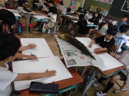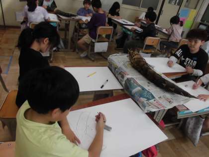 今日は、全体の形や、皮についている線の模様をペンで描きました。来週は、絵の具で色を塗る予定です。迫力のあるたけのこの絵が出来上がりそうで楽しみです。