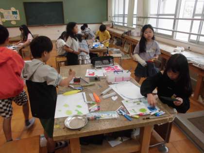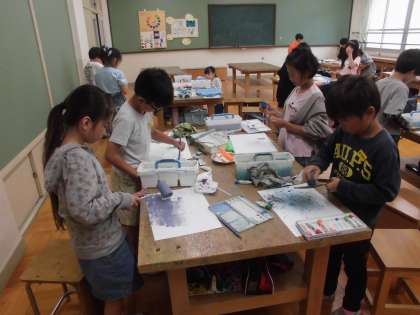 図工の学習で、ストローやローラー、ブラシのなど色々な材料を使って、自分だけのゆめもようをつくりました。