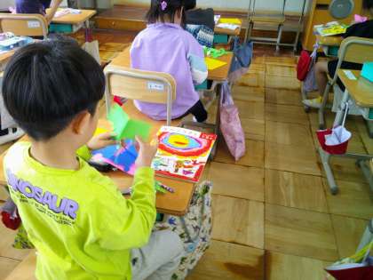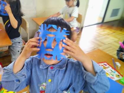 「こんなになった。」「きれいよ。みて。」とうれしそうです。「お面みたい。」と顔に当てている人たちもたくさんいました。