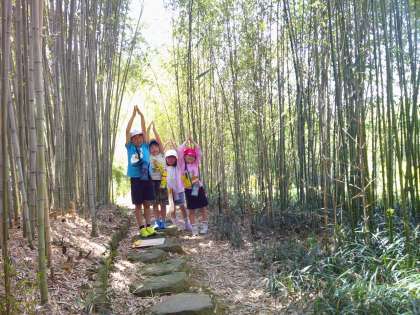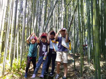 竹林公園では、荷物を置いてウォークラリーをしました。竹のトンネルでは、グループみんなで「たけのこにょっきポーズ」をしました。ミッションをクリアした後は、珍しい竹をみつけに出かけていくグループもありました。