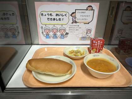 今日の給食は「ミルクコッペパン・牛乳・トマトクリームシチュー・ツナとキャベツのソテー」でした。