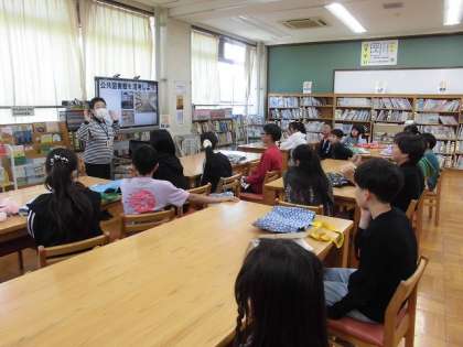 国語科の学習で公共図書館の活用の仕方について、司書の山本先生に教えていただきました。学校図書館との違いや、利用方法などについて紹介していただきました。