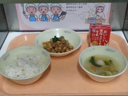 今日の給食は「麦ごはん・牛乳・肉みそいため・はるさめスープ」でした。