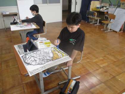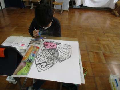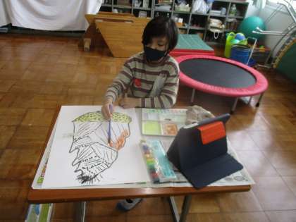 先日、筆を使って描いたたけのこに絵の具で色をつけました。筆の線が残るように薄く塗っていきます。どんな色にしようかなと色を選んだり、色を重ねたりと工夫して色をつける様子が見られました。
