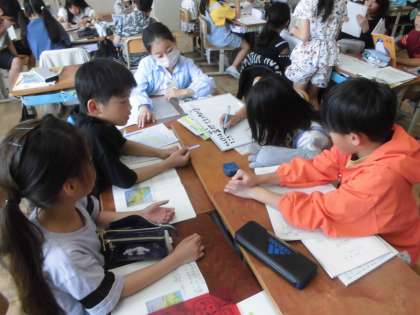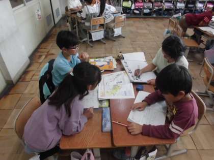まとめの学習として学習問題に戻り、京都府の特徴(地形・交通・人口・土地の使われ方)を班で学んだことをまとめました。