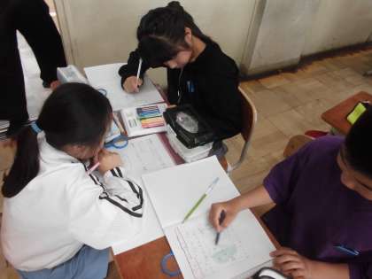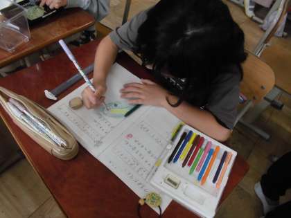 小さな幼虫を虫メガネを使って観察しました。体長はどれくらいかも記録することができていました。