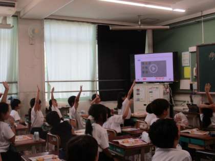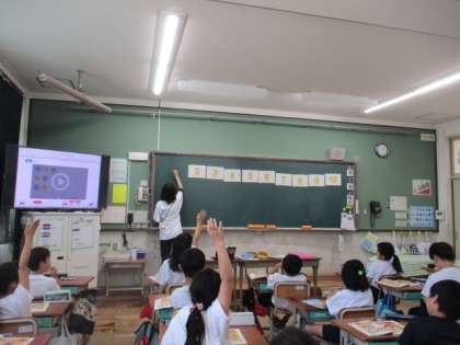 Ten Stepsをうたいながら、友達がえらんだ数を言わずに手をたたいたりして、繰り返しました。数の言い方に慣れ、だんだん上手に。とても楽しそうな外国語活動の時間でした。