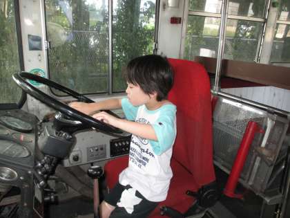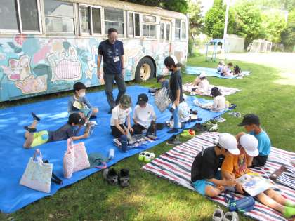 上里小学校の素敵な「ゆうゆうバス」に乗ったり、バスの木陰で気持ちよく読書をしました。1年生にとっては、初めての体験で運転席に座ったり一番後ろの座席に座ってかわいい換気扇を回したり、昭和時代の形の降車ボタンを押したりと大はしゃぎでした。